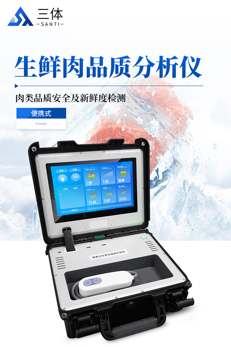 便携式生鲜肉品质分析仪可用于检测生鲜肉的蛋白质、脂肪、水分、pH、TVC、TVB-N、新鲜度、L*、A*、B*等品质参数。配备手提箱式防水减震外壳、大尺寸触控屏幕并内置大容量电池,可一键自动校准,是一款适合移动作业场景的高精度生鲜肉品质检测仪,其可用于生鲜肉及肉品生产、加工、储运企业、肉品品质监管部门等。