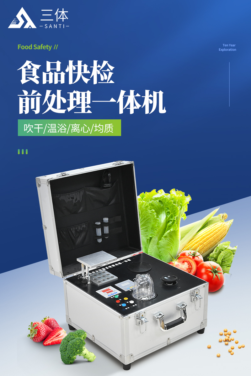ST-QC04四合一食品安全检测前处理一体机乐彩汇(箱)是集吹干,温浴,离心,均质,混匀功能的一体化整合,极大的简化和集中样品前处理的一般操作过程,结合移动便携的全铝合金箱收纳功能,特别适合农兽药残留畜禽水产品质量安全现场快速检测。